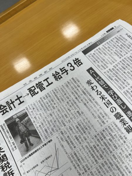 アメリカでは今、電気技師や配管工などの高度な技能を持つ職人が高収入を得る「ブルーカラービリオネア」という現象が起きており、肉体的な仕事の価値が見直されています。2025年12月4日(木)の日経新聞にもアメリカの会計士がAIによっって職を奪われ「配管工」となったと言う記事が大きく誌面を割いて掲載されました。