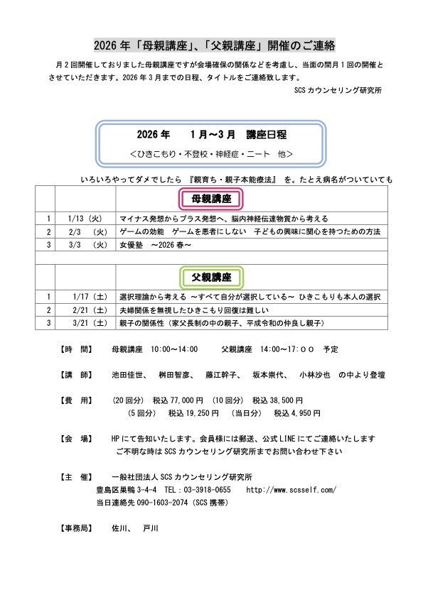 SCSカウンセリング研究所では、ひきこもりから復活するために必要不可欠な親育ち・親子本能療法に関する知識や、親力を養っていただくための講座を月に2回(母親講座は月1回、父親講座は月に1回)開催しております。